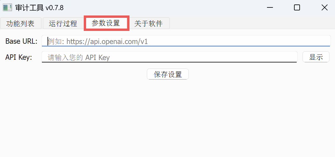 你可以注册一个 AI 平台的账号,将其 base_url 和 API_key 参数填写到审计工具箱的“参数设置”界面并保存。