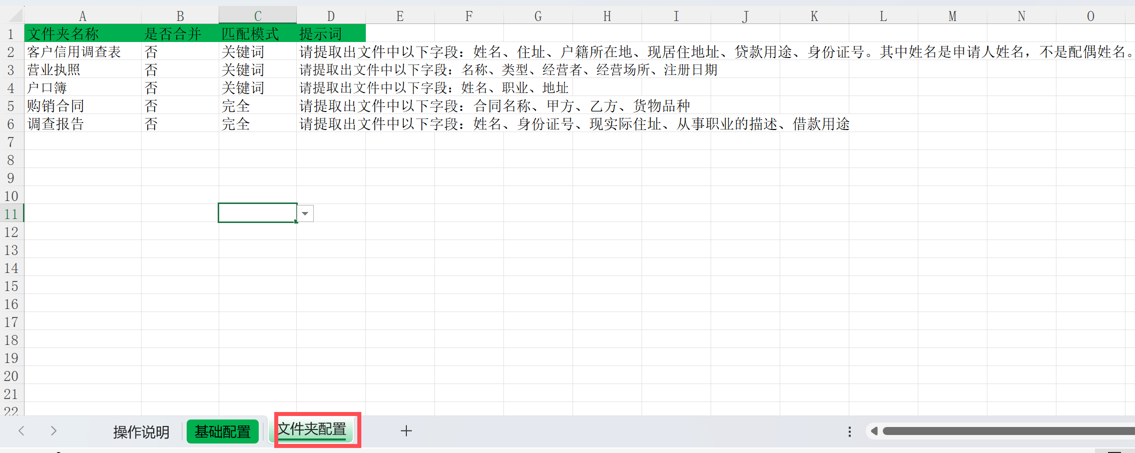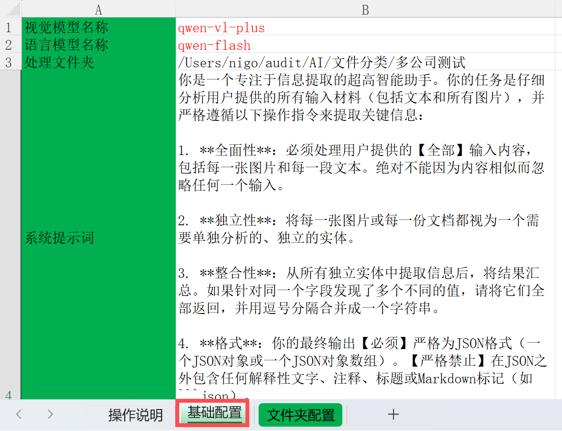 =提示词=,你可以针对这类文件描述你希望提取的字段,有些有歧义的字段,你可以补充相关信息,使AI能准确理解。 =匹配模式=,填“完全”,则会去查找文件夹名称完全一致的进行处理。如果填“关键词”则对包含该名称的文件夹进行处理。
