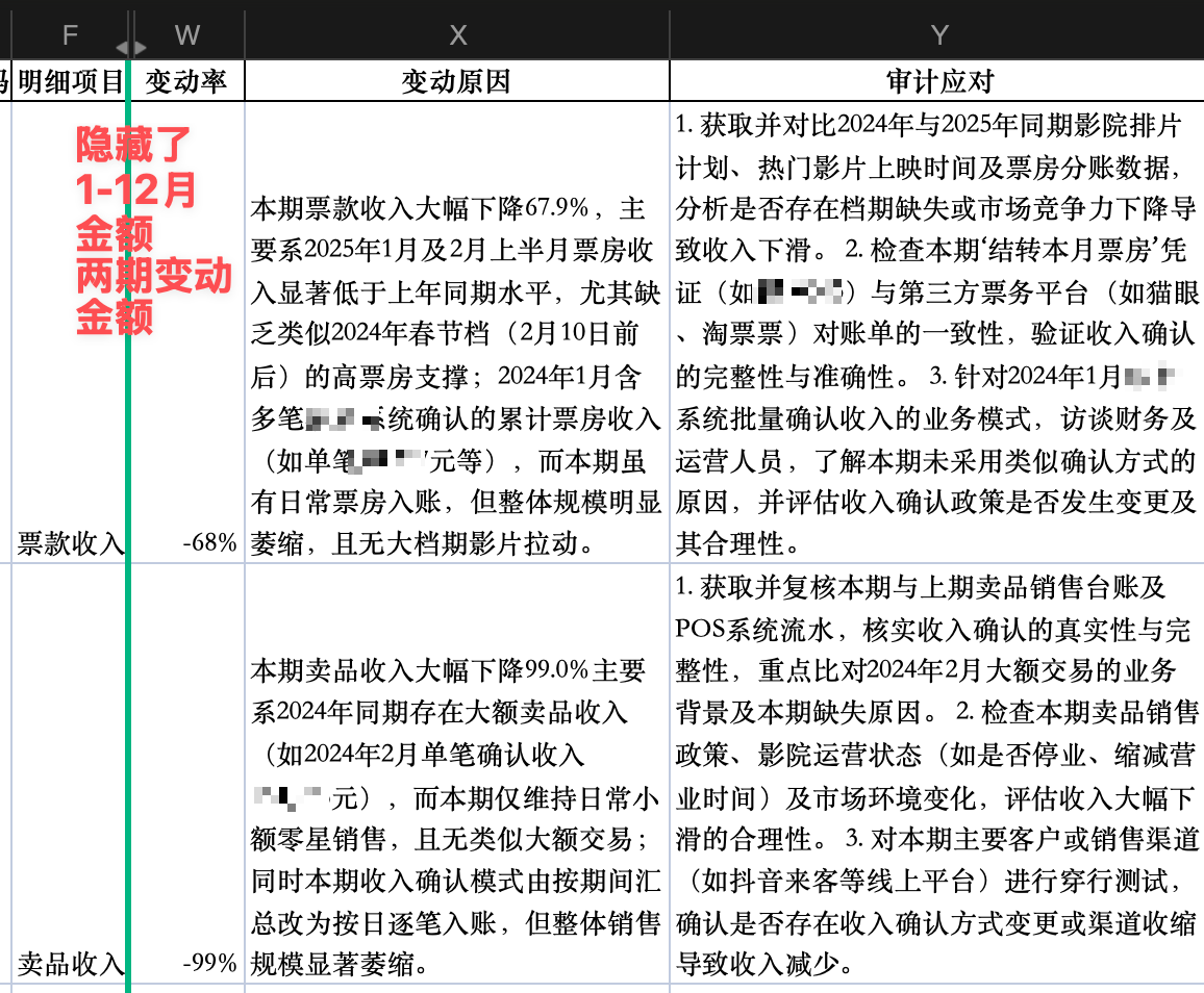 我在之前生成月间分析表的基础上再加入了 原因分析 和 审计应对 。