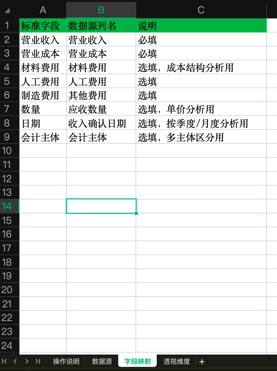 填写标准字段对应你的数据源中的列名,