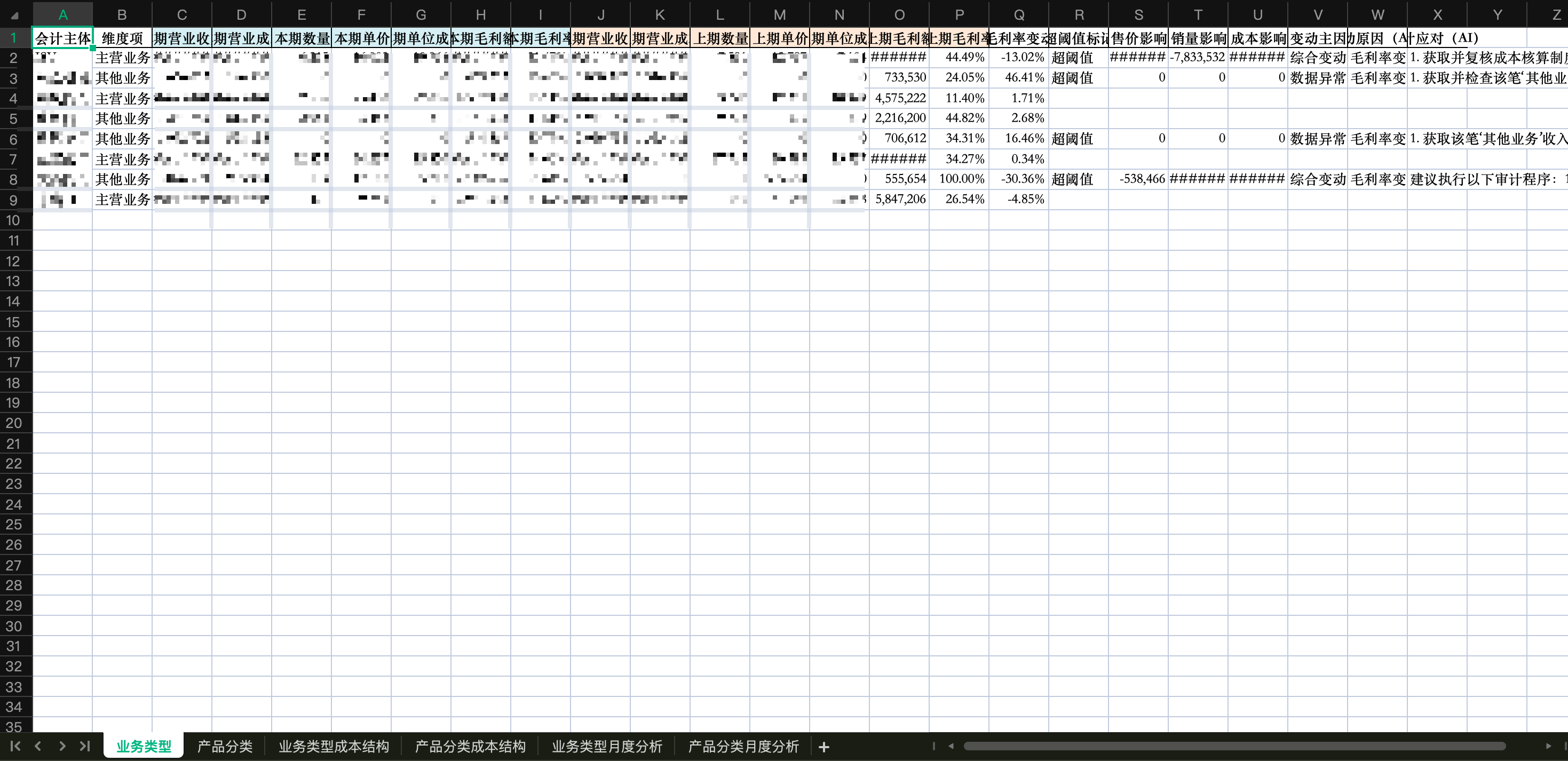 - 毛利率变动表,包含AI 分析波动原因和审计应对。